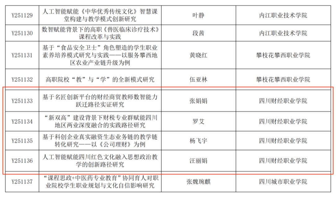 近日,四川省职业技术教育学会公布2025-2026年度职业教育教学改革课题立项名单,我校申报的6项课题全部成功立项,含重点课题2项、一般课题4项。