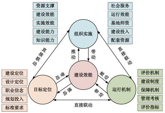 (三)模型构建。“五金”建设是众多因素影响下的复杂非线性过程,根据词频分析结果,“定位”“规划”“资源”“实施”“评价”“机制”等词汇出现频率较高,可以看出,“五金”建设困境因素应该体现在建设目标定位、内外部资源支撑、保障机制、考核评价体系等方面。借鉴OBE成果导向教育理念,从目标定位、组织实施、运行机制三个维度构建分析框架,用以剖析“五金”建设困境的背后逻辑及形成机理。其中,“目标定位”涵盖专业建设定位、课程设计定位、教师职业定位、基地规划投入、教材目标要求5个主范畴;“组织实施”涵盖资源支撑、建设效能、实施效能等10个主范畴;“运行机制”涵盖评价机制、建设制度、保障机制5个主范畴。目标定位、组织实施和运行机制之间,既相对独立又相互作用,从而构成三元交互关系,影响着不同主体的建设效能,具体分析框架如图1所示。