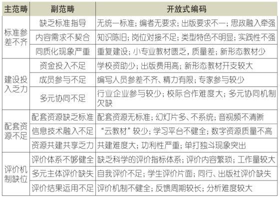 (五)教材建设:存在标准不齐、投入乏力、资源不足和机制缺位问题。一是标准参差不齐。教材建设缺乏统一标准、编者资质标准欠缺,出版社要求标准参差不齐,思政元素融入牵强,对意识形态要求差别较大。部分教材存在知识更新不及时、教材内容与职业标准、岗位规范对接不充分,类型特色不显著。基础类教材重复建设严重,新兴专业的核心教材数量较少,质量意识不强。二是建设投入乏力。新形态教材建设开支较大,资金投入不足。编写队伍参差不齐、投入精力有限、专家参与较少。行业企业参与较少、产教融合力度不足、校际合作难度较大。三是配套资源不足。数字资源标准不一致、建设质量不高。新形态教材数量不足,教材学习平台不健全,无法支撑线上线下融合教学。受功利目标导向、教材版权等因素影响,校企或校际共建教材难度大。四是评价机制缺位。多数院校对教材评价工作不重视,缺乏科学的评价指标体系,多元评价主体缺失。动态监测机制不健全,反馈周期较长,评价结果运用难度较大。