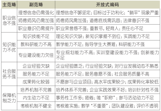 (二)资料编码。首先,对访谈材料进行开放式编码,析出具有意义的子范畴或初始概念。其次,分别对专业建设、课程建设、教师队伍建设、基地建设和教材建设进行主轴编码和选择性编码,依次得出不同的主范畴,并划分主范畴与对应子范畴之间的关系,见表1~5。最后,邀请4名教师开展两轮专家征询,完成理论饱和度检验。