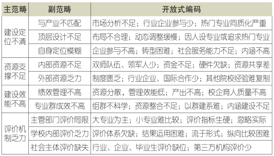 (一)专业建设:存在定位不清、资源不足、效能不高和评价乏力问题。一是专业(群)建设定位不清。专业(群)与区域产业发展对接不紧密,更多从整合学校内部资源出发或简单追崇热门产业,忽略了区域产业发展优势与自身办学条件的相关性。学校层面缺乏整体性专业(群)建设规划,专业(群)布局不合理,动态评估机制缺失,甚至出现因人开设专业或一味追求开设热门专业现象。企业参与协同育人动力不足,人才培养面临两难困境;数字化升级改造乏力,社会服务能力不足。二是专业(群)资源支撑不足。从内部因素来看,院校普遍面临着“双师”不足、专业领军人才匮乏、资金投入不足、仪器设备陈旧等困境;因组群逻辑不合理、保障制度缺失等因素制约,导致学校内部资源共建共享效能不高。从外部因素来看,主管部门制度供给不足、行业企业参与力度有限、国际交流合作成效不显著、其他院校典型经验难以复制,造成外部资源供给乏力。三是专业(群)建设效能不高。单个专业“孤立”建设模式面临着资源分割严重、管理效能不高、投入产出不成比例、校企协同育人成效不高等问题。专业群内资源整合力度不够、跨部门合作困难,影响了群内专业发展。四是评价机制乏力。主管部门主要以量大面广专业(群)为主,按照同类专业(群)进行考核,对于量小面窄专业无法横向评价。学校内部评价缺乏专业(群)之间的横向对比,使评价结果运用困难。行业组织、合作企业、毕业生、第三方评价机构等评价主体,尚存在着合法性不足、独立性不足、专业性不足等困境,其主体价值尚未得到应有重视。