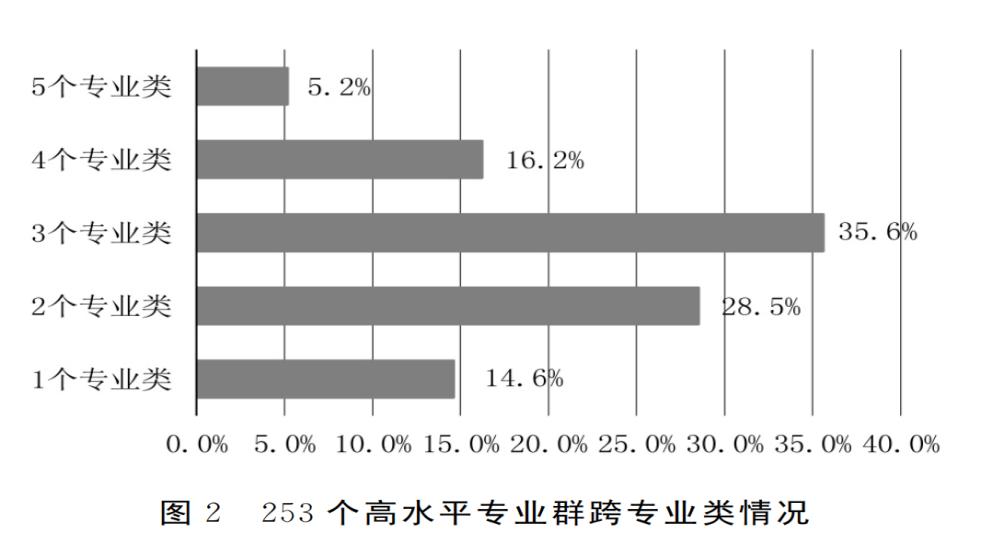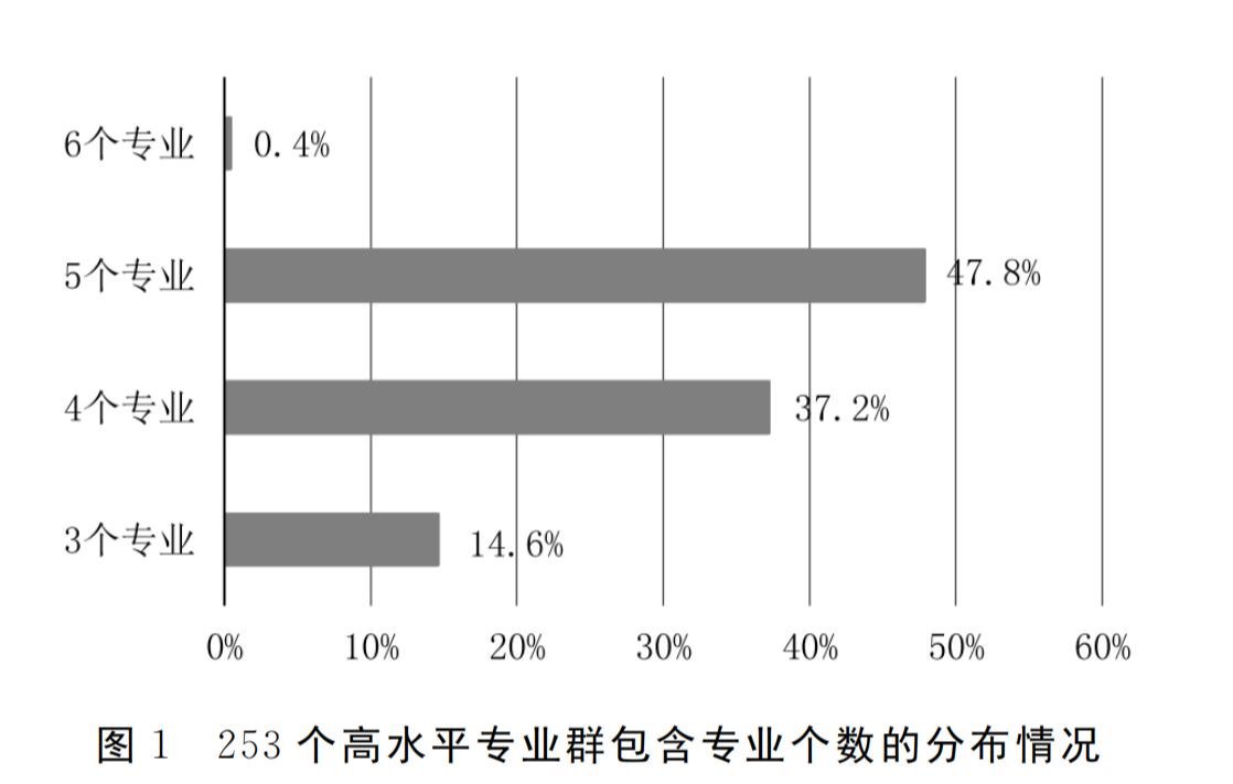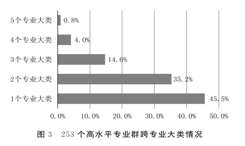 然而对253个高水平专业群跨专业类、专业大类情况的统计分析(见图2、图3)显示,在1个专业类下进行组群的仅占专业群总数的14.6%,跨3个专业类组群的占比最高(35.6%);在1个专业大类下进行组群的虽然占比最大(45.5%),但跨2个专业大类进行组群的占比也有35.2%,跨3个专业大类进行组群的占比为14.6%,甚至有0.8%的专业群跨越5个专业大类进行组群。基于以上分析可以发现,组建专业群不一定局限于某一专业大类或专业类,产业之间、行业之间的交叉融合已成为常态,当今世界对具备多种技能复合型人才的需求越来越强烈,跨行业、跨产业组建专业群已是大势所趋。