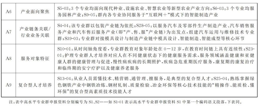 (1)开放性编码。“开放性编码是将原始资料打散、揉碎,重新进行编码和整合,其主要任务是命名和定义类属,并在属性和维度两个层面发展类属。属性是指能够涵盖所有概念共同特质的词语,即对所描述现象进行概括和提炼。”“进行开放式编码时,对于编码者而言,要以一种开放的姿态面对资料,尽可能地将个人偏见和理论定见置于一旁,编码者头脑中不形成任何预先的概念,将所有的资料以其本身所呈现的状态进行登陆”,编码应该“保持开放、贴近数据、保留行动,给其他分析留下可能的空间”。围绕“专业群组建所需考虑的基本影响因素”这一问题,本研究首先对253个高水平专业群的申报资料进行开放性编码,在充分理解文本话语意义的基础上,尽量使用一致或较为接近的代码,采取贴标签的方式对文本资料逐个事件进行编码。如表1所示,通过编码分析共得到了9个概念化类属,以A1、A2、A9对其编码。