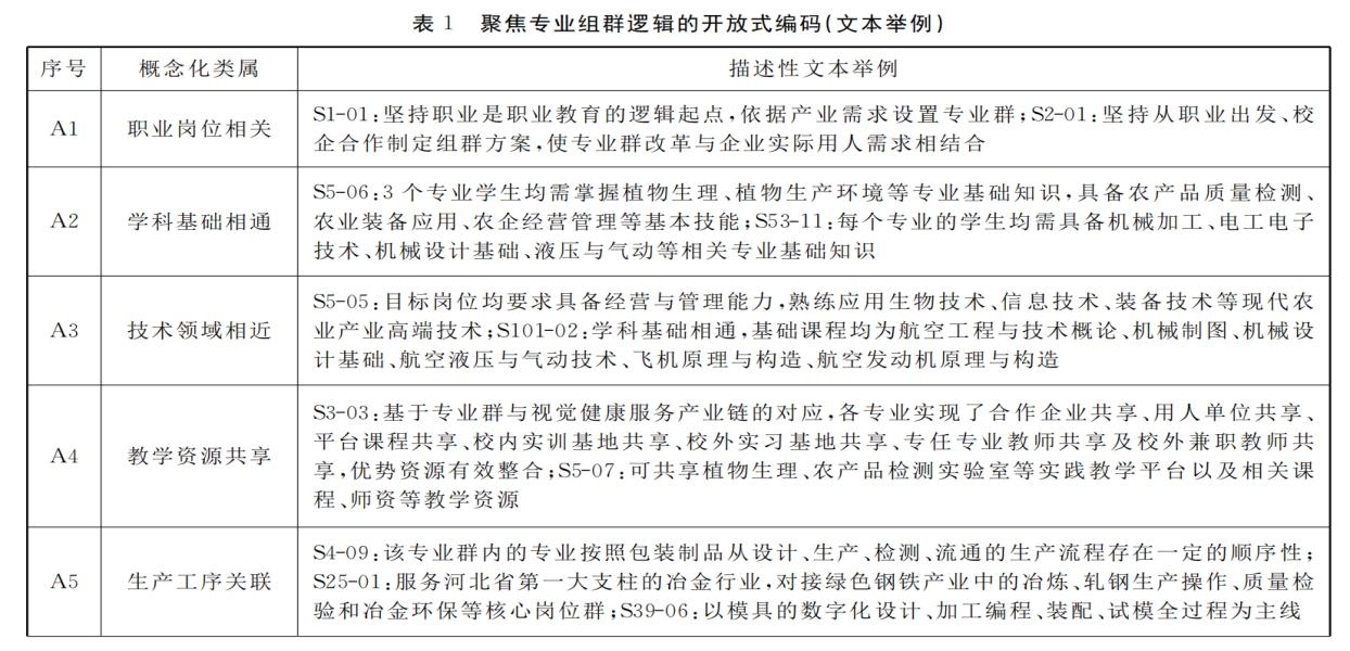 3.研究过程。本研究的质性文本分析工作包含两个基本板块:一是对文本资料进行量化分析,主要通过统计方法描述分析高水平专业群的外显特征,包括专业群涵盖专业的个数、专业群跨专业类和专业大类的个数、专业群布局的产业特征、专业群组织管理模式等。二是对文本资料进行质性分析,采取扎根理论分析方法分析专业组群的内在逻辑、形态特征以及组群策略。扎根理论是一种探索性的研究方法,强调在经验资料、已有文献和研究者个人知识的基础上通过收集和分析资料建立理论。一般而言,采用扎根理论方法分析文本资料的过程包含开放性编码(opencoding)、主轴编码(axialcoding)和选择性编码(selectivecoding)三个步骤。本研究亦对文本资料进行了三级编码,研究者在编码分析过程中形成了维度体系,并在维度体系形成过程中发掘新的编码,与此同时也不断对编码进行调整、删除、合并。本研究在编码分析到第83个专业群的申报资料的时候,已无新编码出现,基本达到理论饱和,而后为避免遗漏又进一步分析到第108个专业群的申报资料,确定没有新编码出现。