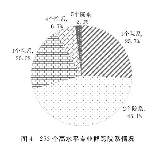 对253个高水平专业群申报资料的量化分析发现,高职院校在专业群的组织管理上采取了多样化策略(见图4),依托1个院系对专业群进行组织管理的仅占所有专业群的25.7%,组织管理跨2个院系的专业群占比为45.1%,跨3个院系的占比为20.6%,甚至还有组织管理跨5个院系的专业群(2.0%)。由此可以发现,专业群的组织管理模式呈现多样化的形态,将所有专业纳入一个院系进行管理的“以群建院系”模式并不是主流,跨院系建群则占据了主导地位。这表明产业之间的交叉融合尽管需要专业集群发展,但并不意味着不同学科、行业背景的教师一定要在同一个院系。