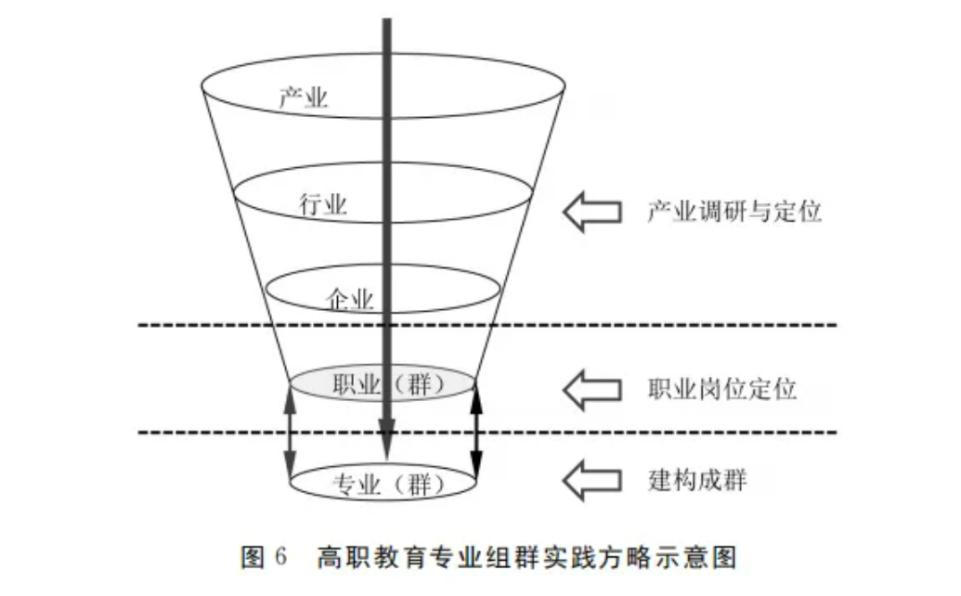 职业岗位定位的主要目的是在产业定位的基础上,进一步明确专业群服务面向的职业岗位群。根据定位层次的不同,职业岗位之间的关联也呈现多样性特征,如定位于产业层面是产业链关联,定位于行业层面是行业业务关联,定位于企业层面则主要是生产程序的关联。在定位产业与职业岗位群的基础上,专业组群的最后一步就是建构成群,该步骤的主要工作是将职业岗位群转换为职业教育群。这需要首先对职业岗位所要求的知识与技能进行分析,根据知识基础的相关性对相关职业岗位进行打包,然后明确职业生涯发展路径,基于专业目录和专业教学标准对不同职业生涯发展路径进行专业命名,最终明确专业群与职业岗位群的映射关系。