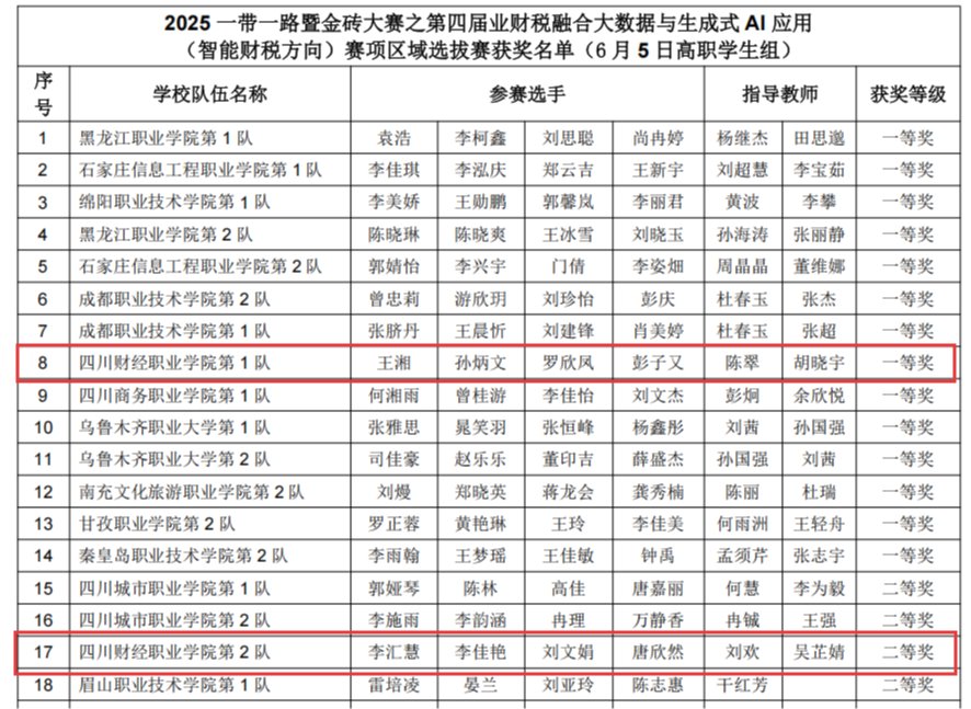 在激烈的竞赛中,我校财税学院教师(陈翠、胡晓宇、刘欢、吴芷婧)带队指导的两支参赛队伍表现出色。其中,由王湘、孙炳文、罗欣凤、彭子又组成的1队,以及李汇慧、李佳艳、刘文娟、唐欣然组成的2队,均充分展示了扎实的财税专业知识、精湛的技能水平以及良好的团队协作精神。经过激烈的角逐,两队分别荣获区域赛高职学生组一等奖和二等奖的好成绩,其中1队还获得了晋级决赛的名额。