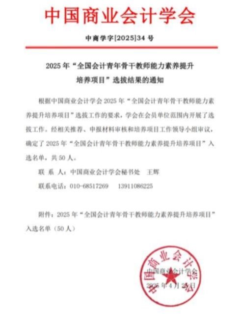 近日,会计学院教师郭霞成功入选中国商业会计学会“2025年全国会计青年骨干教师能力素养提升培养项目”。