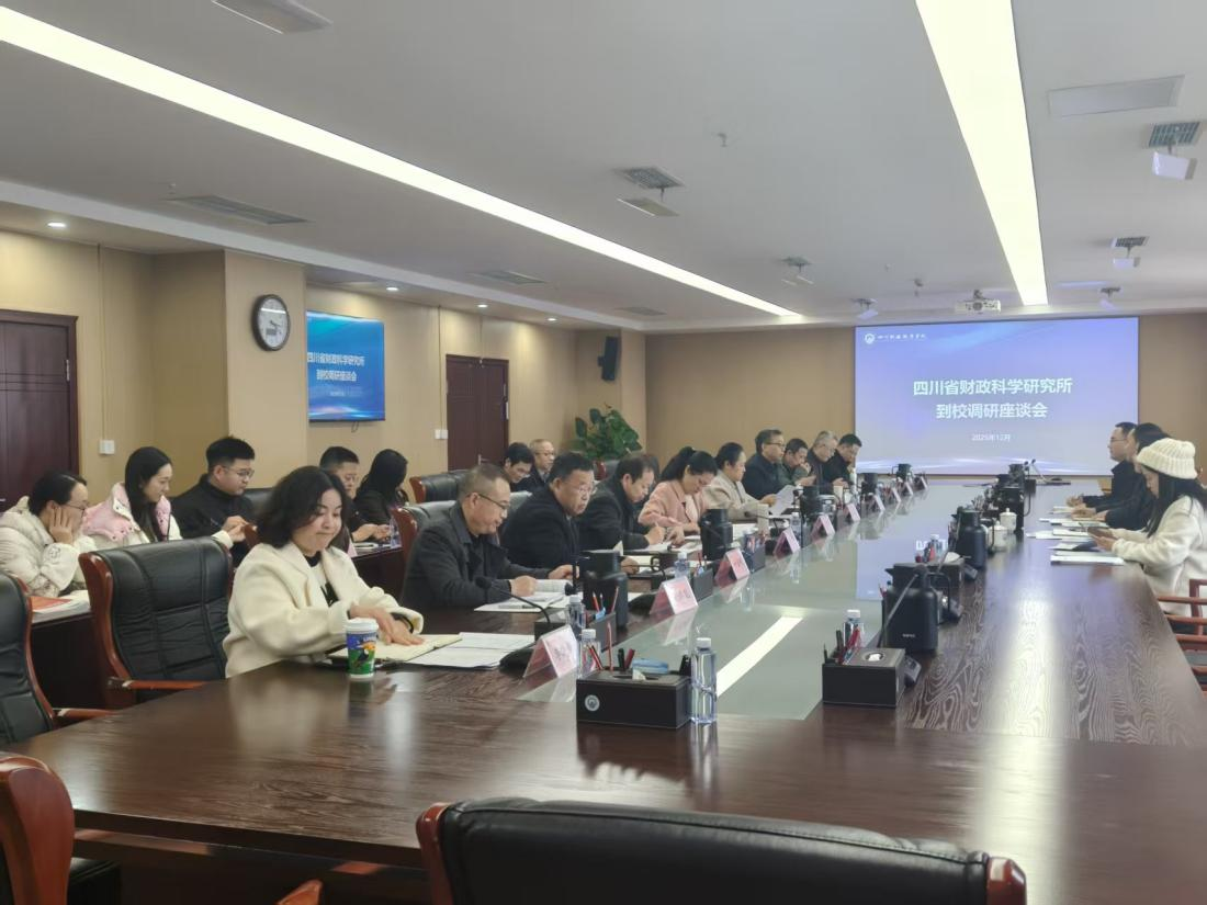 12月3日下午,四川省财政科学研究所所长吴正新一行四人到校开展调研,就加强财经政策研究合作、推动资源共享与智力支持等内容进行专题调研座谈。学校党委书记张华,院长符刚,四川省珠算协会、图书馆、科研与发展规划处以及预算绩效管理研究中心等校内10个科研平台负责人参加座谈会。