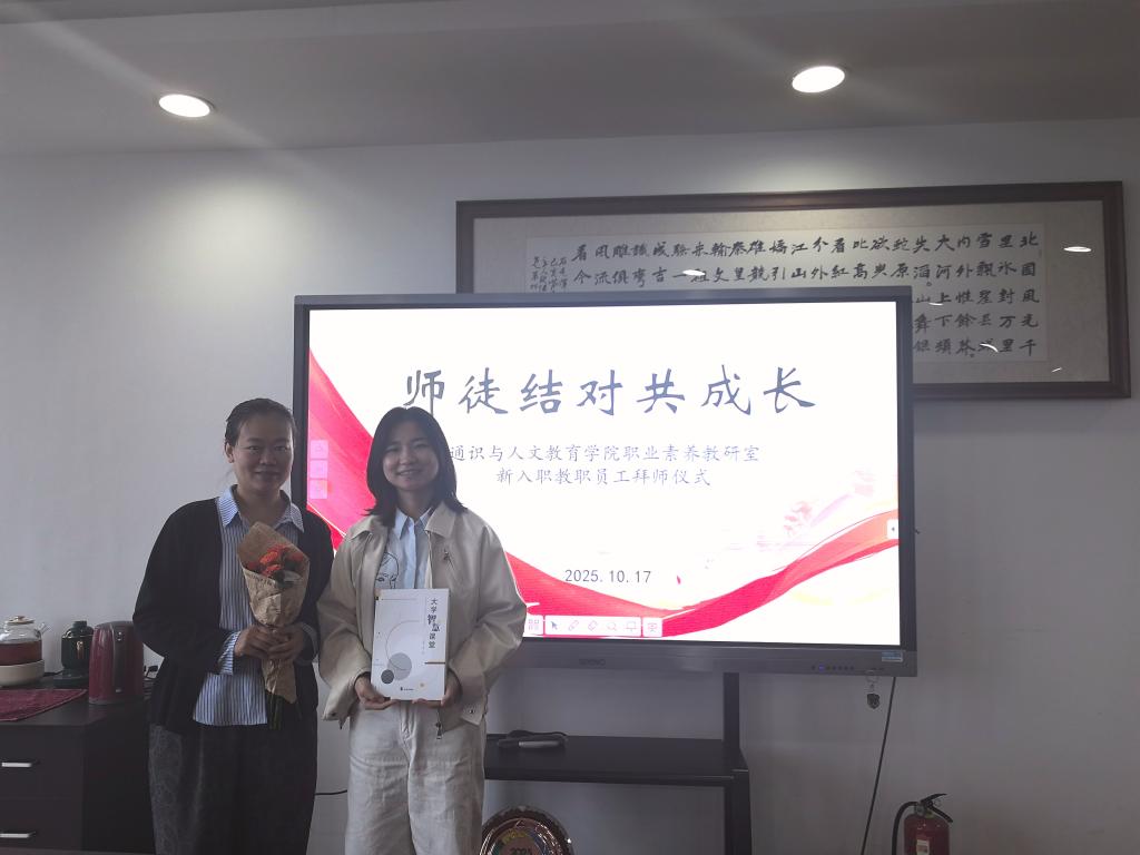 为进一步提升学院教师队伍的整体素质,加速青年教师的专业成长,充分发挥资深教师“传、帮、带”作用,2025年10月17日,通识与人文教育学院职业素养教研室在明德楼713会议室举行新进教职员工拜师仪式。