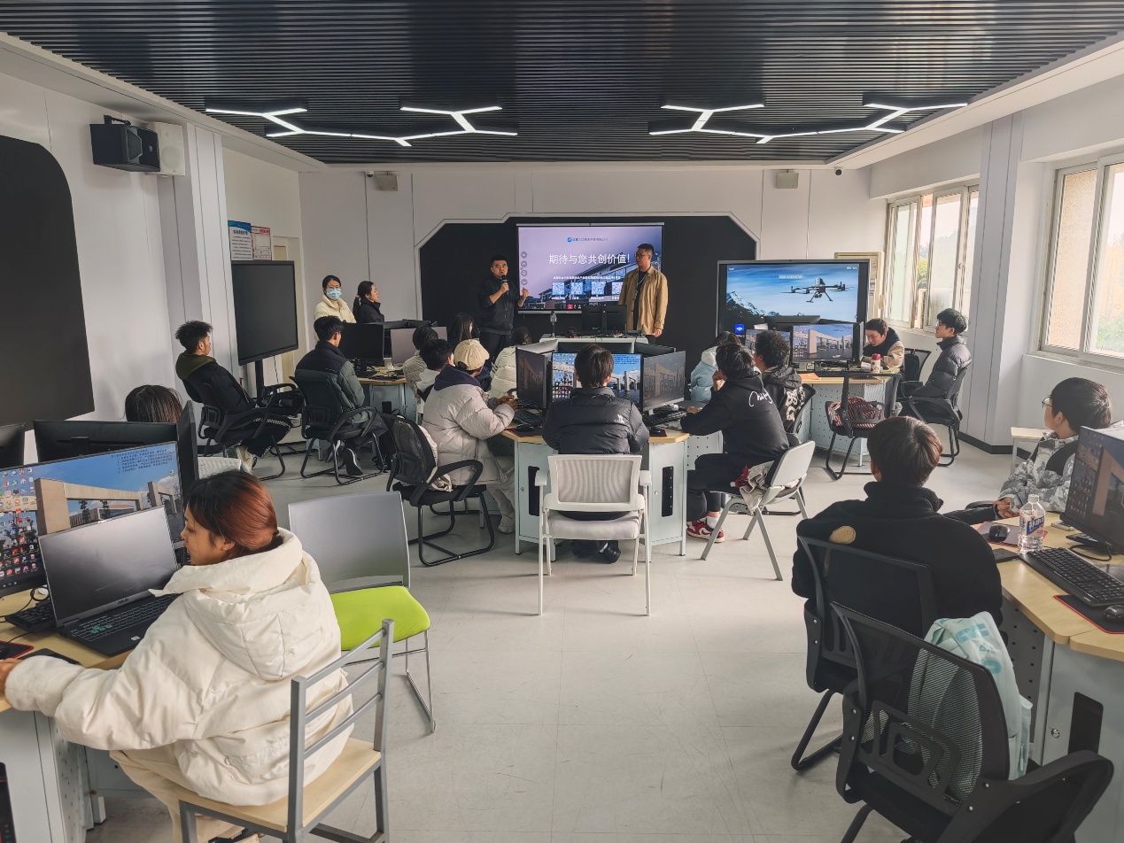 为深化无人机专业实践教学,精准对接行业人才需求,提升学生对地理信息数智化应用能力,推动低空经济产业与教育教学深度融合。11 月 25 日,信息学院无人机应用技术专业于A307 开展了低空经济数智化地信解决方案服务商培训会。本次培训特邀成都九江伟业科技有限公司专家关楚伦技术总监主讲,无人机应用技术专业负责人展鹏老师主持会议,专业教师范微维、吕欢欢组织无人机专业学生参会。