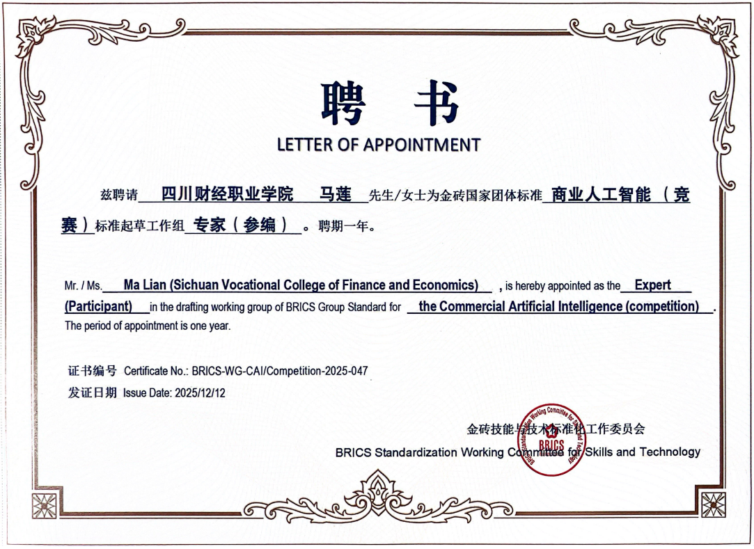 我院大数据技术教研室主任马莲受邀参与此次高水平国际会议,并凭借深厚的专业积淀与丰富的教学实践经验,成功受聘为金砖国家团体标准“商业人工智能”标准起草工作组专家,更标志着大数据技术专业正式跻身金砖国家技能标准化建设的国际协作网络,为专业国际化建设迈出了具有开创性意义的第一步。